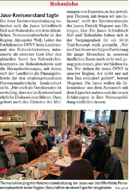 "Bei ihrer Kreisvorstandssitzung befassten sich die Jusos Schwäbisch Hall und Hohenlohe mit dem öffentlichen Personennahverkehr in der Region. "